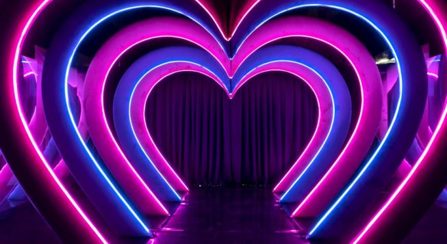 «Questa è una mostra da condividere», spiega Lara Martinetto, pr communication manager di Next Exhibition. Proprio così: più ci si addentra nel percorso più questo diventa instagrammabile, volto a configurarsi come un vero e proprio viaggio da documentare a più persone possibili. Ecco che ci si può addentrare in un tunnel di cuori azzurri e rosa realizzato con neon e velluto (luogo caro a questa mostra dal momento che, in una precedente edizione a Napoli, sotto questa installazione è stata celebrata una promessa di matrimonio): una passerella che nulla ha da invidiare a un red carpet. Si procede poi in una sala che sala che si potrebbe definire erotica, dove viene celebrata la passione tra gli amanti e sormontata da una scritta We are not friends dal colore rosso fuoco, ispirata alleatmosfere infernali del V canto della Divina Commedia di Dante, con protagonisti Paolo e Francesca.