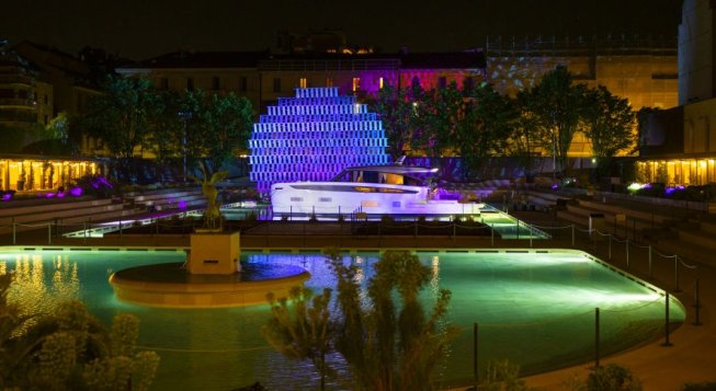 Il percorso tra dentro e fuori culmina all’esterno. Da una terrazza sull’acqua si apre una vista inaspettata, in uno scenario urbano onirico e sospeso, dove al chiaro di luna è ormeggiato il Seadeck 6, incarnazione della rotta tracciata da Azimut per abbattere emissioni di Co2 e consumi energetici. Lo yacht, infatti, offre una riduzione delle emissioni fino al 40% in un anno di uso medio. Scandole specchiate in acciaio zincato lucido formano un grande disco ispirato alla luna, il cui gioco di riflessi enfatizza l’effetto dinamico della trama di luce, evocando il bagliore lunare.