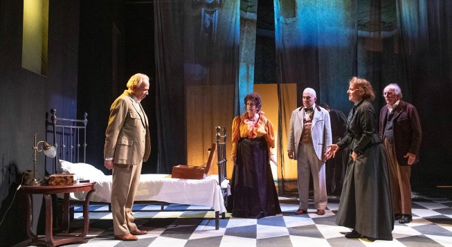 Geppy Gleijeses impersona uno dei personaggi più iconici della letteratura pirandelliana, Mattia Pascal. L’uomo, creduto e poi fintosi morto, una volta risuscitato si accorge di non poter essere riammesso in società e in famiglia, perché ritenuto morto davvero. Disonestà e purezza, vita e morte regnano nel grande caleidoscopio della certezza sociale, che suggella come sicuro quello che non esiste e come inesistente quello