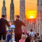 In programma c'è un ricco calendario di date, a partire da mercoledì 4 giugno 2025 e, successivamente, il giovedì sera fino all’11 settembre 2025 (con l’eccezione di giovedì 19 giugno), incastonato nell’affascinante cornice di marmo che offre la possibilità di apprezzare una prospettiva d’eccezione su Milano e così ammirare i tanti ornati, archi rampanti, le falconature ricamate nella pietra come merletti, fino ad arrivare alle 135 guglie che accarezzano il tramonto meneghino. Uno spettacolo straordinario al calar del sole per affascinare ed incantare il pubblico milanese ed i visitatori di tutto il mondo, coinvolti, anche quest’anno, per la nuova rassegna di accompagnamenti musicali dal vivo.