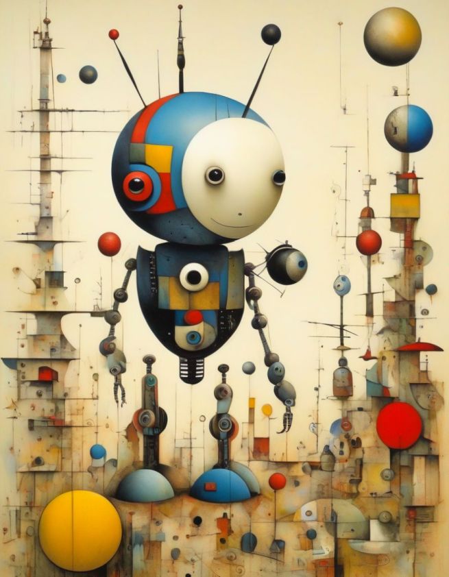 Jarre ha ideato brevi testi poetici che l’intelligenza artificiale traduce in immagini di creature ibride, sospese tra il mondo umano e quello meccanico: questi esseri vivono in uno spazio liminale, incarnando tensione e armonia tra creatività umana e calcolo algoritmico. La mostra racconta non solo il risultato visivo, ma anche il processo creativo. Dopo una prima fase in cui Jarre perfeziona i suoi prompt fino a vedere emergere le figure desiderate, in un secondo momento l’artista ribalta il procedimento: chiede all’intelligenza artificiale di generare un nuovo prompt partendo dalle immagini, una sorta di interpretazione spontanea da parte della macchina. Questo ping-pong creativo genera titoli poetici, ambigui, a volte ironici, che accompagnano ogni opera, aggiungendo ulteriori strati di lettura. Ed è con questa interazione tra uomo e intelligenza artificiale, dove l’uomo interroga l’intelligenza artificiale chiedendole quasi un giudizio, che Jarre sembra completare il cerchio, come se l’intelligenza artificiale avesse capacità di pensiero e di critica.