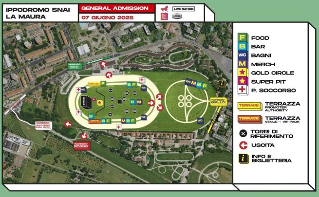 L'accesso all'Ippodromo La Maura è dal Parco di Trenno (varco di via Lampugnano) per i possessori del biglietto Golden Circle (rosso) e da via Ippodromo (incrocio via Montale) per chi ha invece un biglietto standard (giallo). Se ce ne fosse bisogno, ricordiamo che per accaparrarsi le migliori postazioni occorre presentarsi in largo anticipo. All'ingresso viene creata un'area di pre-ingresso dove si può accedere previa esibizione del biglietto e controllo con metal detector: in questa fase vengono ispezionati singolarmente borse e zaini e il materiale non idoneo non può essere introdotto all'interno dell'Ippodromo: tra gli oggetti vietati ci sono anche gli ombrelli, per cui in caso di pioggia è consigliabile munirsi di impermeabili o kway.
