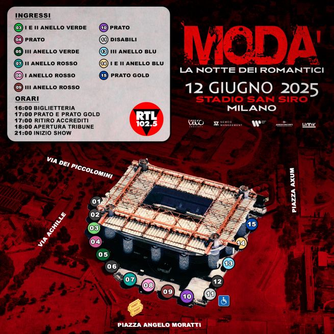 Dopo Elodie e Pinguini Tattici Nucleari, tocca ai Modà salire sul palco dello stadio San Siro di Milano per il concerto-evento La Notte dei Romantici. L'appuntamento - unica data estiva dei Modà, oltre al live di sabato 28 giugno 2025 alla Fiera di Cagliari, e prima del tour autunnale nei palasport - è per giovedì 12 giugno 2025.