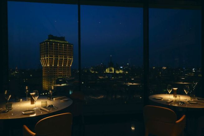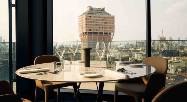 L’idea alla base di Orizzonti nasce dalla tradizionale passione italiana per il buon cibo e la convivialità, e va oltre il concetto puramente estetico di ristorante panoramico per creare un vero e proprio percorso sensoriale. Il primo scenografico impatto dell'ospite all'ingresso è quello della vista: lo sguardo sullo skyline di Milano - con il Duomo e la Torre Velasca in primo piano, per arrivare a quella che è l’essenza visiva, l’orizzonte delle Alpi sullo sfondo-– diventa parte integrante dell’esperienza, ispirando il nome stesso del locale. Il panorama che si dissolve nell’orizzonte lascia poi spazio alle scelte di interior design e conduce infine a una proposta culinaria senza confini.