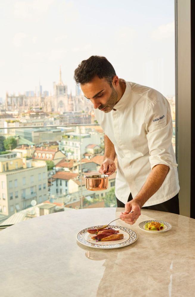 A guidare la cucina è lo chef Luca Pedata, insieme a Giuseppe Robustella, suo sous-chef da anni. Classe 1989, con esperienze nelle grandi cucine italiane - tra cui dieci anni come main chef da Carlo e Camilla in Segheria - ed europee, Pedata propone una carta elegante e concreta che reinterpreta la tradizione mediterranea attraverso tecniche contemporanee, un’attenta selezione stagionale degli ingredienti e un approccio responsabile che valorizza ogni componente, minimizzandone gli sprechi. Dai signature dishes come i Cappelletti alla Genovese 360° (piatto simbolo dell’etica del recupero), Uovo o Provola? (gioco visivo e gustativo che cela un uovo affumicato) o la Pastiera Cruda (dessert che omaggia la memoria e l’infanzia, evocando la consistenza e il profumo dell’impasto della torta appena preparata), fino alle proposte stagionali, come ad esempio, per l’estate: Capesante, caviale e anguria (crudo di capasanta, anguria marinata all’acqua di mare, caviale e latte di mandorla), Spaghettone con datterino e lardo di seppia (datterino giallo, lardo di seppia, fragole fermentate e nero di seppia), Ricciola all’acqua pazza (ricciola semimarinata, pomodoro all’acqua pazza, latticello e basilico), Cioccolato, pesca e verbena (torta caprese, ganache fondente, gelato alla verbena, pesche al Moscato e cardamomo), solo per citarne alcune. Non mancano piatti vegetariani, vegani e gluten-free.