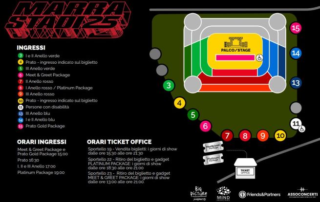 Eccoci ora ad altre informazioni fondamentali per chi va a vedere Marracash in concerto a San Siro: gli orari. Sia mercoledì 25 che giovedì 26 giugno 2025 l'orario di apertura dei cancelli fissato per le ore 16.30 per i possessori di biglietti per il prato (e prato gold), mentre chi ha un biglietto per il primo, il secondo e il terzo anello ha mezz'ora in più di tempo: i cancelli per l'accesso alle tribune aprono alle ore 17.00. Infine, i possessori del Platinum Package possono prendersela ancora più comoda: per loro l'ingresso è alle ore 19.00, con ritiro del biglietto è allo sportello 22 in orario 18.30-21.00. Allo sportello 19, in orario 15.30-21.30, sono invece in vendita gli ultimissimi biglietti eventualmente rimasti, mentre lo sportello 23 è quello dedicato al ritiro del biglietto Meet & Greet Package, in orario 13.00-21.00.