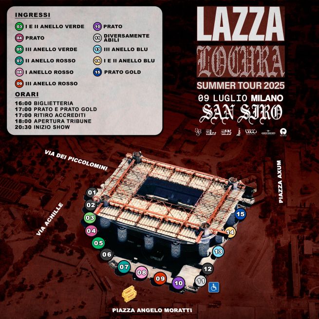 Chiuso il capitolo biglietti, eccoci ora ad altre informazioni fondamentali per chi va al concerto di Lazza: gli orari. L'orario di apertura dei cancelli è fissato per le ore 17.00 per i possessori di biglietti per il prato (e prato gold), mentre chi ha un biglietto per il primo, il secondo e il terzo anello ha un'ora in più di tempo: i cancelli per l'accesso alle tribune aprono alle ore 18.00. Gli orari per apertura biglietteria e ritiro accrediti sono rispettivamente alle ore 16.00 e alle ore 17.00. L'inizio del concerto è alle ore 20.30. Di seguito la mappa degli ingressi a San Siro in base alle diverse tipologie di biglietti.