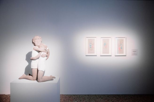 L'abbraccio più forte - Questa sala è forse un momento di decompressione per la mostra: l’unico dove si vede un contatto tra i soggetti di Berruti. Questo progetto si chiama L’abbraccio più forte, decine di disegni realizzati nel 2020 e venduti per finanziare l’ospedale di Verduno, che faticava ad aprire i battenti durante il Covid. Grazie a questa operazione, che raccoglie oltre 140.000 euro, Berruti non solo aiuta l’ospedale ad aprire il reparto per i malati di Covid, ma finanzia anche un poliambulatorio mobile, utilizzato ancora oggi per servizi sanitari degli abitanti della zona. Da quelle tavole sono nate due ulteriori opere: una scultura inedita e una video animazione per la quale è stata fatta una open call per musicisti: hanno risposto in più di 100, da ogni parte del mondo. L’abbraccio, come l’arte, è un segno universale. E allora i visitatori di More than Kids decideranno chi sono questi bambini. Siamo noi? Chi è la persona che vorremmo abbracciare in questo momento?