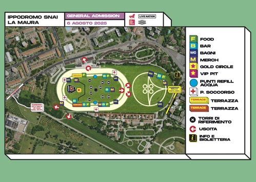 Dove si entra? L'accesso all'Ippodromo La Maura è da via Ippodromo (angolo via Montale, dove è anche posizionata la biglietteria) per chi ha un biglietto standard, mentre i possessori di biglietti gold circle e vip pack con ingresso anticipato possono entrare unicamente dal varco di via Lampugnano (ingresso del Parco di Trenno). All'interno dell'area, dall'orario di apertura dei cancelli, è a disposizione dei fan un photo wall, così come sono disponibili su tavoli vicono agli ingressi speciali Fan Banners da ritirare gratuitamente fino a esaurimento scorte.