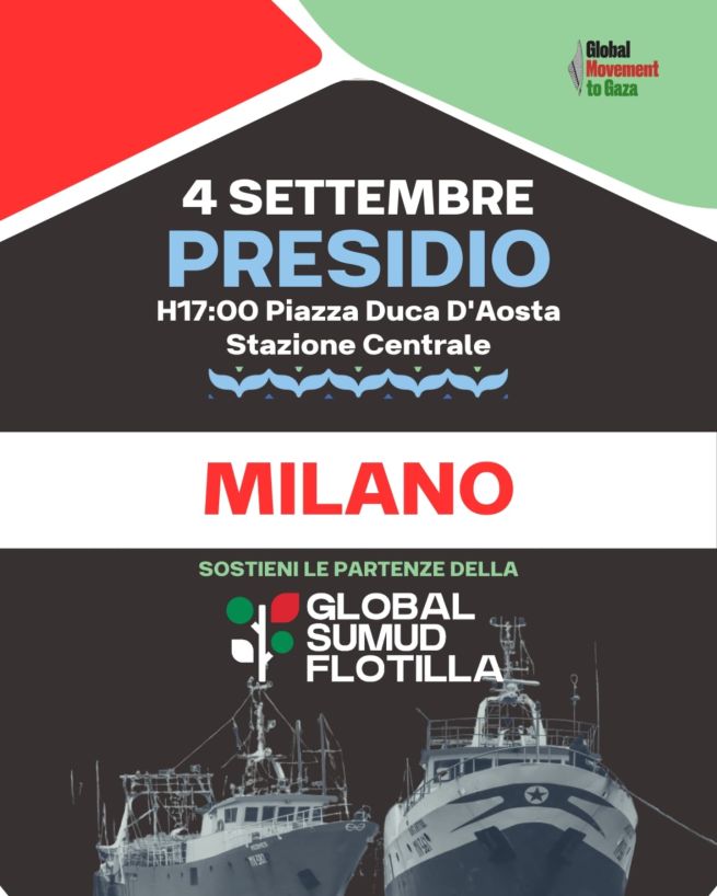 Giovedì 4 settembre in tutta Italia sono organizzati presidi a sostegno della partenza della Global Sumud Flottilla. La flotta di aiuti umanitari, che è salpata anche da Genova lo scorso 31 agosto, dopo una manifestazione che ha visto la partecipazione di 50 mila persone.