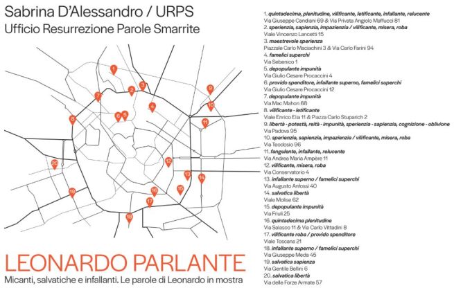 Con la mostra Leonardo Parlante, Sabrina D’Alessandro, attraverso il suo progetto Urps (Ufficio Resurrezione Parole Smarrite), accende i riflettori sull’aspetto meno noto del genio rinascimentale: quello di collezionista di vocaboli. Un Leonardo che, durante la sua permanenza a Milano, per arricchire il proprio lessico, trascrisse circa ottomila termini sotto forma di lunghe liste nel Codice Trivulziano 2162, il suo libretto di appunti oggi conservato presso l’Archivio Storico Civico e Biblioteca Trivulziana al Castello Sforzesco di Milano. La mostra è frutto di una ricerca inedita tra lessicografia e arte visiva, che restituisce alla memoria le parole di Leonardo attraverso installazioni e affissioni pubbliche.