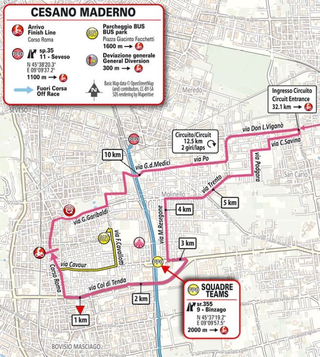 Il percorso del circuito di Cesano Maderno prevede la svolta alla rotonda in via Ripamonti e subito dopo in via Bacone, e prosegue in via Cassina Savina, via Rimembranze, via del Carso, via Podgora, via Padova, via Trento, via Molino Arese, fino alla svolta in via Monte Resegone e successivamente in via Manzoni, che viene percorsa per un breve tratto prima della svolta a U che consente l'imbocco di via Col di Tenda (Tangenziale Sud). Poco dopo il ponte sul Seveso si gira in corso Roma, che viene percorso fino all'incrocio con corso della Libertà: dopo la svolta a destra si prosegue su via Torrazzo, via Garibaldi, via Barbarossa, via San Carlo, via dei Mille, via De Medici, via Po, via Trento e via don Viganò, che chiude il circuito ad anello.