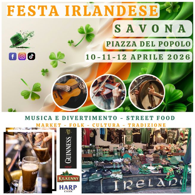 A Savona, in piazza del Popolo, arriva la Festa Irlandese. Appuntamento da venerdì 10 a domenica 12 aprile 2026: tre giorni di musica live, birra, street food, mercato e tradizione. Un'atmosfera unica, tutta da vivere, tra suoni celtici, sapori autentici ed energia. Maggiori informazioni, orari e aggiornamenti sulla pagina facebook Festa Irlandese - Irish Experience Tour.
