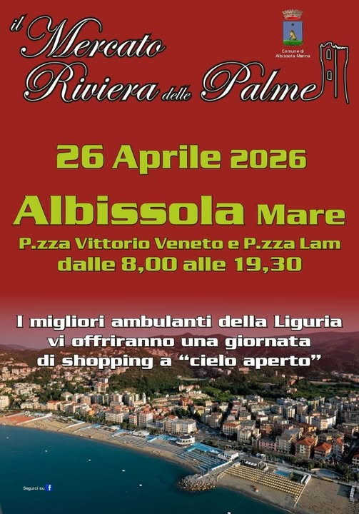 Il Mercato Riviera delle Palme fa nuovamente tappa ad Albissola Marina durante il suo tour ligure: l'atteso mercato a cielo aperto torna in domenica 26 aprile 2026, dalle 8 fino alle 19.30. Appuntamento in piazza Vittorio Veneto e piazza Lam con i migliori ambulanti della Liguria per una giornata di shopping a cielo aperto.