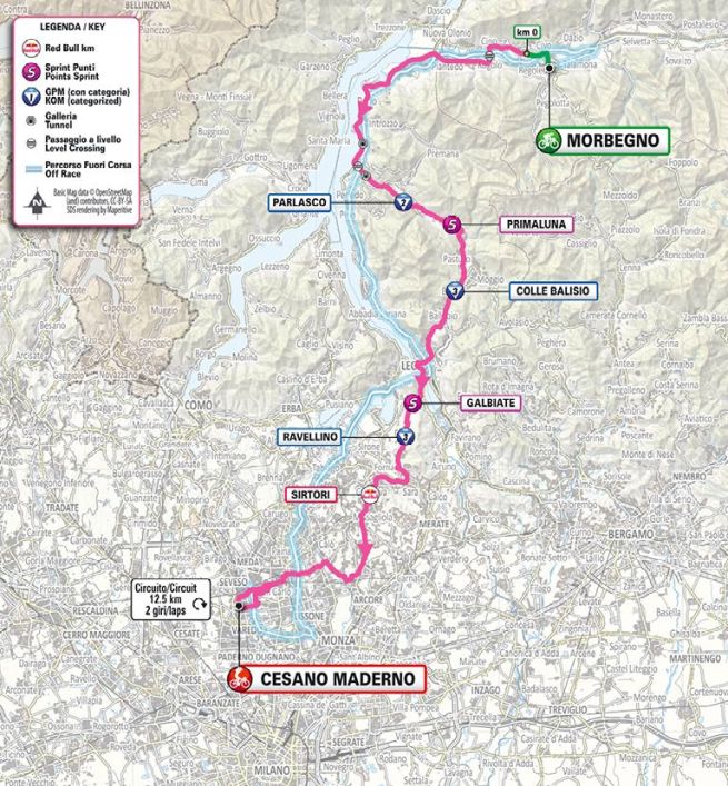 Percorse via Montello e via Cavour, il percorso cittadino a Seregno prosegue svoltando in corso Matteotti e transitando successivamente in via Stefano da Seregno, piazza Roma, via Sciesa, via Milano, via Colzani. A questo punto - sono circa le ore 16.25 - è previsto l'inizio del circuito cittadino di Cesano Maderno, che i ciclisti sono impegnati a completare due volte: qui il percorso dettagliato del circuuito cittadino a Cesano Maderno e l'elenco di orari e strade chiuse nella città brianzola; più in basso invece le modifiche alla viabilità previste a Morbegno.