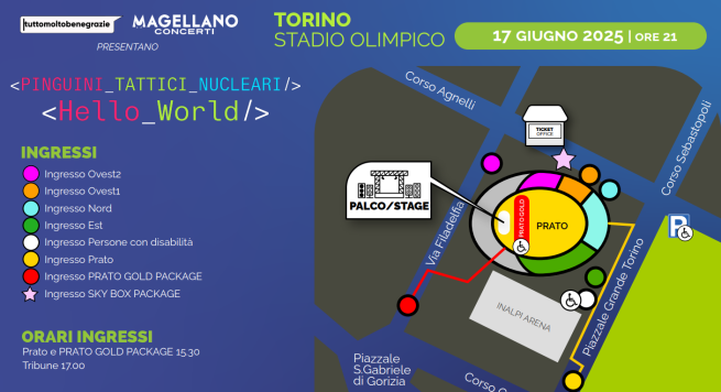 Il concerto dei Pinguini Tattici Nucleari inizia alle ore 21. I cancelli per chi ha il biglietto per il prato e il prato gold aprono alle 15.30, per le tribune alle ore 17. Nell'immagine qui sotto si possono vedere gli ingressi e i varchi di accesso a seconda della tipologia di biglietto.