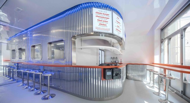 L’ambiente riflette l’identità del brand: uno spazio progettato dallo studio Boffa Petrone & Partners, che fonde suggestioni industriali e digitali con un’estetica retrofuturista dal gusto pop. Il risultato è un luogo accogliente, ironico e contemporaneo, pensato per un pubblico urbano attento al design e ai nuovi linguaggi del food.