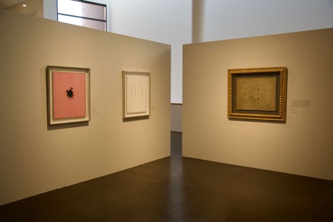 La mostra si apre con una prima ampia sezione che introduce la temperie culturale internazionale, così come si sviluppò tra gli anni Venti e Trenta del secolo scorso, ovvero quando Kandinsky, con le sue lezioni al Bauhaus, elabora un sistema in cui colore, linea e forma diventano espressione dell’interiorità. In questo contesto si inserisce il dialogo con Paul Klee, compagno di insegnamento e di ricerca, di cui si presenta un importante nucleo di opere, realizzate tra il 1913 e il 1938. Dai paesaggi simbolici e lirici delle origini alle composizioni geometriche del periodo di Dessau, i lavori di Klee testimoniano la profonda affinità intellettuale tra i due maestri, fondata sull’idea che la pittura sia scrittura dello spirito e costruzione musicale dello spazio. Accanto a Klee, la sezione riunisce opere di Jean Arp, Joan Miró, Alexander Calder e Antoni Tàpies, figure che condividono con Kandinsky la tensione verso un’arte capace di superare i confini del reale e di trasformare la forma in energia vitale. Le loro ricerche, diverse per linguaggio ma affini nella visione, delineano il vasto orizzonte europeo entro cui prende corpo l’astrazione come linguaggio universale.